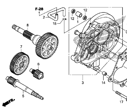 Here's our gears! Discover how information technology'due south rotated 180 degrees from the Honda Microfiche... Silly engineers. The Concluding Gear is on the left, the Counter Gear is in the middle, and the Drive Shaft is on the right. Recall, those are Honda terms, not mine.